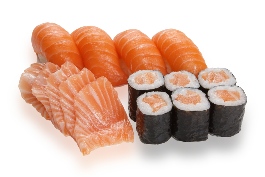– 6 Maki saumon – 4 Sushi saumon – 5 Sashimi saumon (servis avec soupe miso, salade choux et riz nature)
